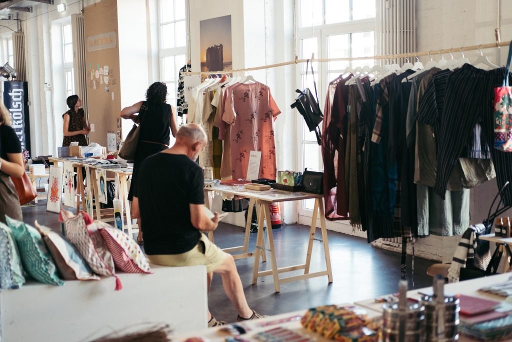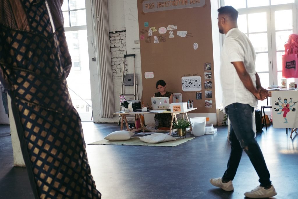 In addition to these two central works, a colourful mixture of different artworks can be seen that are connected to India in different ways. Graphic designers take traditional visual languages of India and adapt them to current issues such as the impact of digitalisation. Photographs show the examination of the textile industry, which has interacting consequences on a glocal level. Visitors are invited to interact at various points; for example, screen prints with exclusive motifs can be created. Other works involve the viewer without being asked: the augmented reality work by Vimal Kandoth puts a virtual mask of the traditional ritual theatre Theyyam on the viewer. A design market invites visitors to browse and underlines the progressive flair of the exhibition with carefully selected products. Around 500 visitors let themselves be carried away into a transcultural world and attended the many events such as meditation workshops, parties, supper club and presentations.“ – Helena de Anta