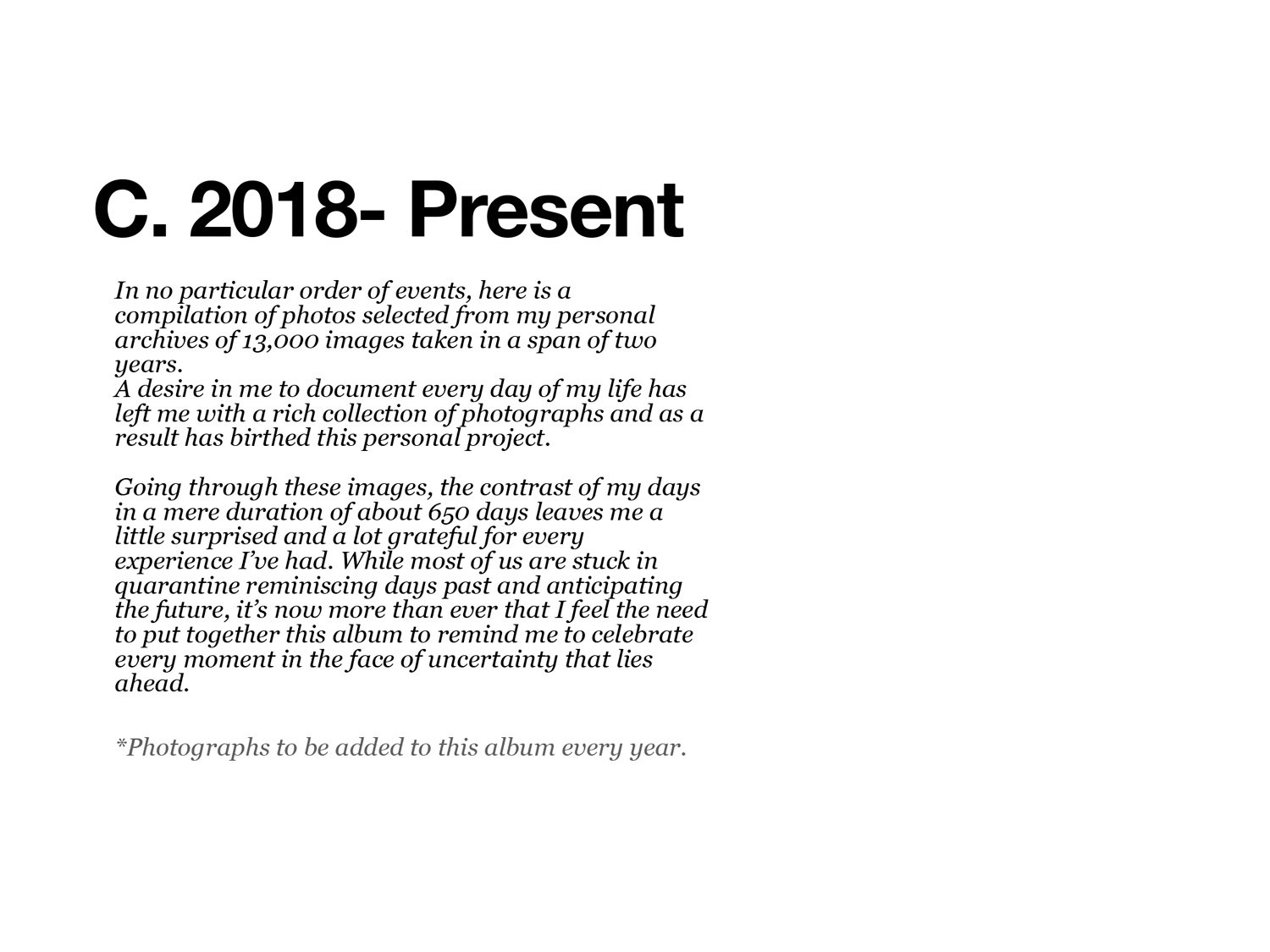 The desire to document every day of life has led me to a rich collection of photographs. In the past two years I have created an archive with 13,000 images from which this photo project was created. When I look at the pictures, especially now, I realize how precious every single moment is. – Asmi Shetty